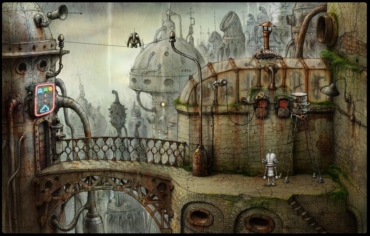 The final ‘boss fight’ of Machinarium is so unpleasant that I put the game down for a whole month. Though the rest of the game is a rather calm, contemplative thing, something that can be solved easily with an old and fuzzy laptop touchpad, the final ‘puzzle’ requires a mouse and infinite patience. You must play an extremely long and badly-designed Flash game for which no rules or objectives are given. Dying pulls you out into the world again, where you must repeat a few trivial adventure-game actions in order to reenter the fight. I died countless times, mainly because my screen was wider than the game file itself (Machinarium is Flash) and every time my cursor left the game panel, I would lose control of the character and die. Furthermore, it’s a mouse-aim game with no separate controls for your avatar: you trail around after the aim cursor, able to control your own position only indirectly. I’m sure that not everyone had as huge of a problem with it as I did; nevertheless, it’s so badly designed that I doubt it would do well as stand-alone gameplay. Which is important in a game that’s partially about games. It’s not the main theme, but it’s prominent, and I expected better.